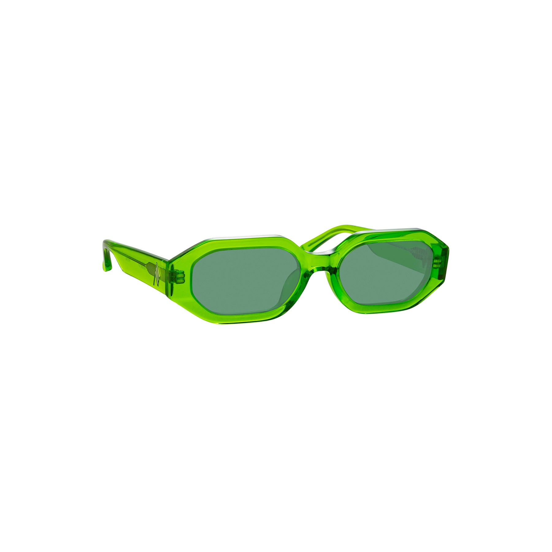 L'ultimo aggiunto alla famiglia The Attico, gli occhiali da sole Irene portano con sé l'attitudine della maison milanese. Scolpite in un ricco acetato verde trasparente, le montature angolari dalla forma esagonale sono lucidate a specchio per conferire morbidezza al tatto. Le aste recano un logo monogramma dorato e lo stile è completato da lenti grigie tinta unita per una protezione UV al 100%.